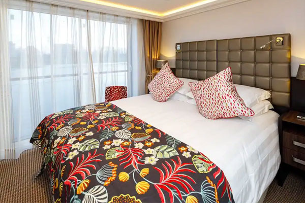 Africa Cruise & Land Safari: Suites on the Zambezi Queen include private balconies overlooking the Chobe River, en-suite bathrooms with Bao Body amenities, floor-to-ceiling glass windows for riverside views, sliding shutters for sun protection and privacy, private in-room safes and sliding mosquito net doors.