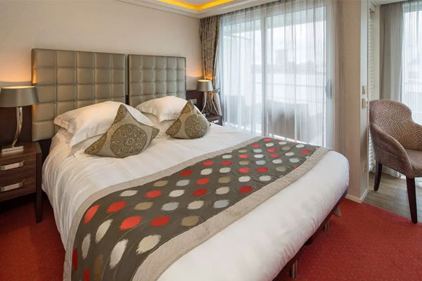 Africa Cruise & Land Safari: Suites on the Zambezi Queen include private balconies overlooking the Chobe River, en-suite bathrooms with Bao Body amenities, floor-to-ceiling glass windows for riverside views, sliding shutters for sun protection and privacy, private in-room safes and sliding mosquito net doors.