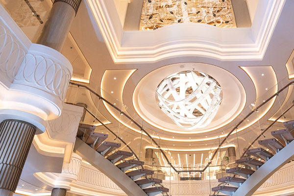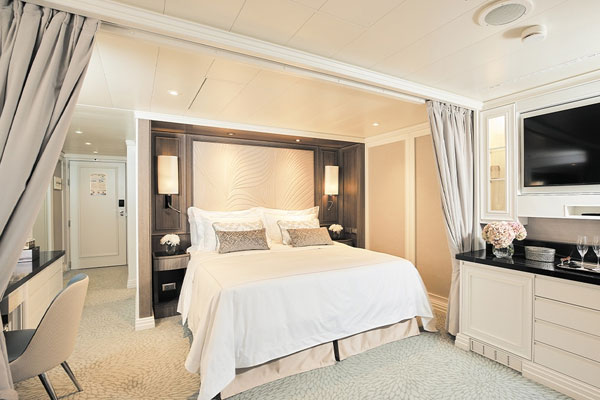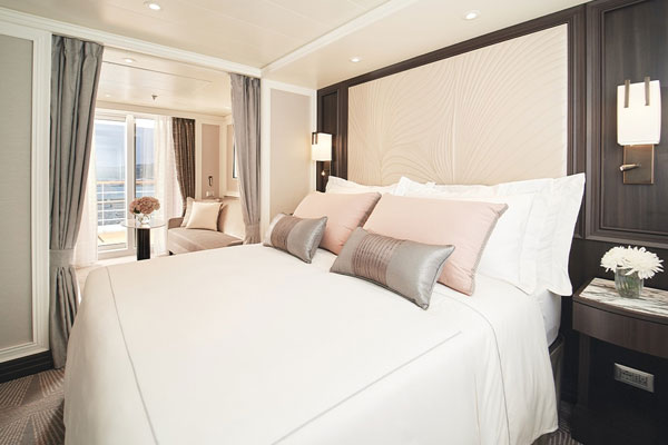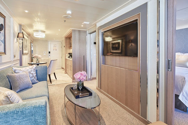 No matter how large you choose to live on Seven Seas Grandeur®, the same exceptional standards of design and comfort apply to every suite. Layouts range from 307 to 4,443 square feet (28.5 to 413 square meters), and all include a furnished private balcony.